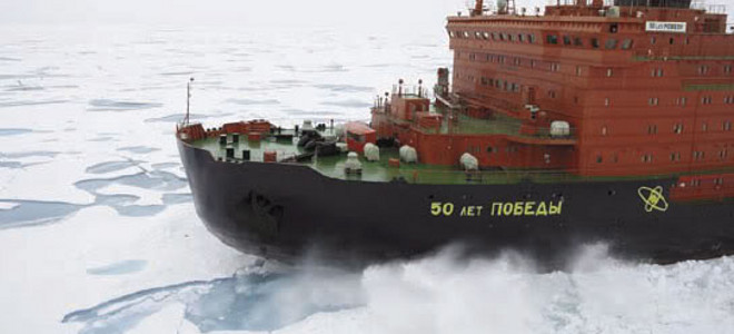 Το νέας γενιάς ρωσικό πυρηνοκίνητο παγοθραυστικό «σπάει» τα παγωμένα νερά και ανοίγει το θαλάσσιο δρόμο στα υπόλοιπα πλοία για να έχουν ασφαλή πλεύση ανάμεσα στους πάγους.