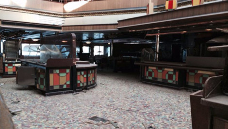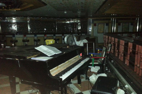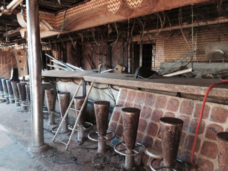 Ένα πιάνο, σχεδόν άθικτο, δίνει την εντύπωση πως είναι έτοιμο να βγάλει ήχους. Απογυμνωμένα καλώδια κρέμονται πάνω από το μπαρ, ενώ οι περίτεχνα διακοσμημένοι τοίχοι του έχουν καταστραφεί.