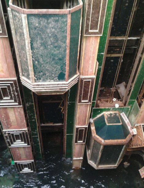 Τα δωμάτια και οι διάδρομοι δεν θυμίζουν σε τίποτα το λαμπερό κρουαζιερόπλοιο που «χτένιζε» τη Μεσόγειο. Στο κομψά διακοσμημένο lobby τα ασανσέρ είναι ακόμα γεμάτα θαλασσινό νερό.