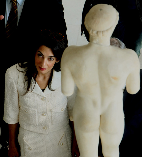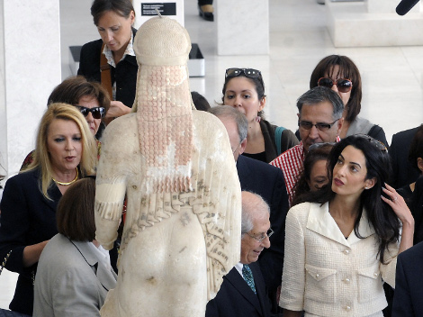 Η ερώτηση που όλοι περίμεναν δεν άργησε να έρθει και αφορούσε τον Τζορτζ Κλούνεϊ και το εάν θα έχει μια πιο ενεργή παρέμβαση στο θέμα των Γλυπτών του Παρθενώνα. Η Αμάλ χαμογέλασε και είπε πως, αν και βρίσκεται σε αρχικό στάδιο του γάμου της αλλα ξέρει ότι δεν πρέπει να μιλά εκ μέρους του «ο ίδιος θα κάνει τις επιλογές του». Τόνισε πάντως ότι έχει την συμπαράσταση του συζύγου της. Αμήχανη ήταν και η στιγμή που ρωτήθηκε για την Αμφίπολη. Η Αμάλ είπε πως ενημερώθηκε χθες για την υπόθεση, είδε και τις εντυπωσιακές φωτογραφίες, όμως δεν θεωρεί ότι το θέμα αυτό έχει σχέση με την υπόθεση των Γλυπτών.