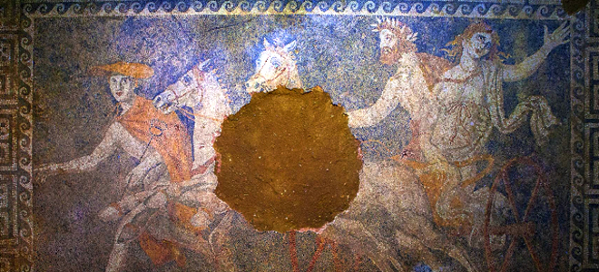 Πάνω από το ψηφιδωτό που αποκαλύφθηκε την περασμένη Πέμπτη και δείχνει την αρπαγή της Περσεφόνης από τον Πλούτωνα έχει τοποθετηθεί φελιζόλ και από πάνω ξύλινη επένδυση.