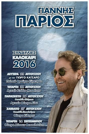Γιάννης Πάριος, ένας από τους σημαντικότερους τραγουδιστές της Ελλάδας. Το όνομά του είναι συνδεδεμένο με τις λέξεις έρωτας, αγάπη, επιτυχία, ταλέντο. Το "φαινόμενο Πάριος", με τη συγκινητική απήχηση στον κόσμο, έχει εμφανιστεί στα μεγαλύτερα θέατρα του κόσμου και δείχνοντας μεγάλο σεβασμό και αφοσίωση σε αυτό που κάνει, έχει καταφέρει να είναι χαραγμένος στη συνείδηση όλων, τόσο ο ίδιος ως καλλιτέχνης, όσο και τα τραγούδια του. Έχει τραγουδήσει τον έρωτα, γράφει στίχους και μουσική και τα τραγούδια του έχουν μεταφραστεί σε πολλές γλώσσες.