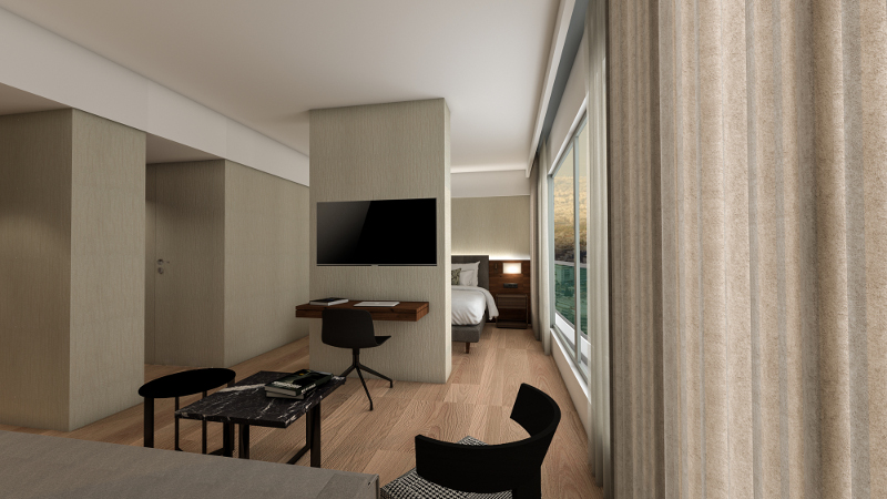 Υπερσύγχρονα δωμάτια εξοπλισμένα με φυσικά υλικά, όπως ξύλο και μάρμαρο,