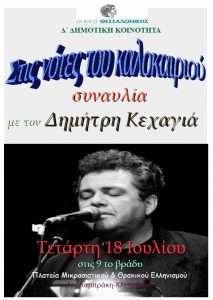 Η Δ΄ Δημοτική Κοινότητα διοργανώνει την συναυλία με τον Δημήτρη Κεχαγιά “Στις νότες του καλοκαιριού”, την Τετάρτη 18 Ιουλίου στις 9 το βράδυ, στη πλατεία Μικρασιατικού και Θρακικού Ελληνισμού. Στην συναυλία που θα πραγματοποιηθεί με ελεύθερη είσοδο θα παρουσιαστούν αγαπημένα τραγούδια Ελλήνων συνθετών.