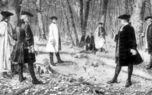 On July 11, 1804, former Secretary of the Treasury Alexander Hamilton is mortally wounded in a duel with US Vice President Aaron Burr. Hamilton, an American founding father who established the nation’s financial system, is challenged to a duel of honor after he campaigns against Burr, who is running for governor of New York. Hamilton, who is in his late forties, dies one day after being shot. (Drawing of Burr-Hamilton duel by unknown illustrator from a J. Mund painting.) |