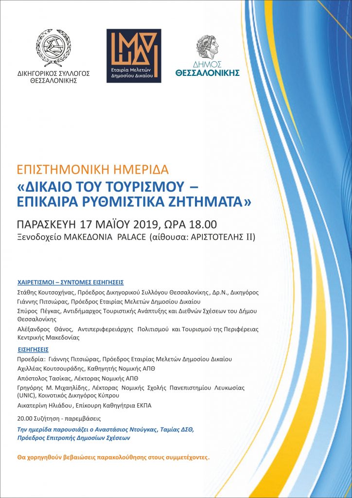 ο Δήμος Θεσσαλονίκης διοργανώνουν επιστημονική ημερίδα με θέμα “Δίκαιο του τουρισμού – επίκαιρα ρυθμιστικά ζητήματα” την Παρασκευή 17 Μαΐου 2019 και ώρα 18.00 στο ΜΑΚΕΔΟΝΙΑ PALACE ( αίθουσα Αριστοτέλης ΙΙ)