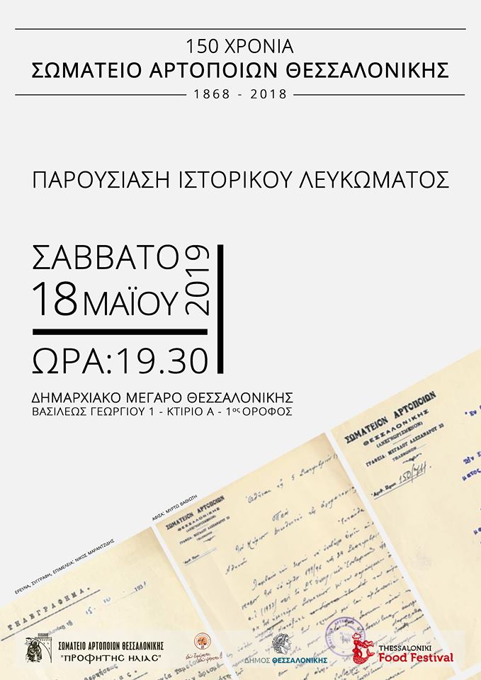 Ο Δήμος Θεσσαλονίκης στο πλαίσιο του 9ου Thessaloniki Food Festival , το Σάββατο 18 Μαΐου και ώρα 7.30 το απόγευμα στη αίθουσα Δημοτικού Συμβουλίου παρουσιάζει το Ιστορικό Λεύκωμα του Σωματείου Αρτοποιών Θεσσαλονίκης “Ο Προφήτης Ηλίας”.