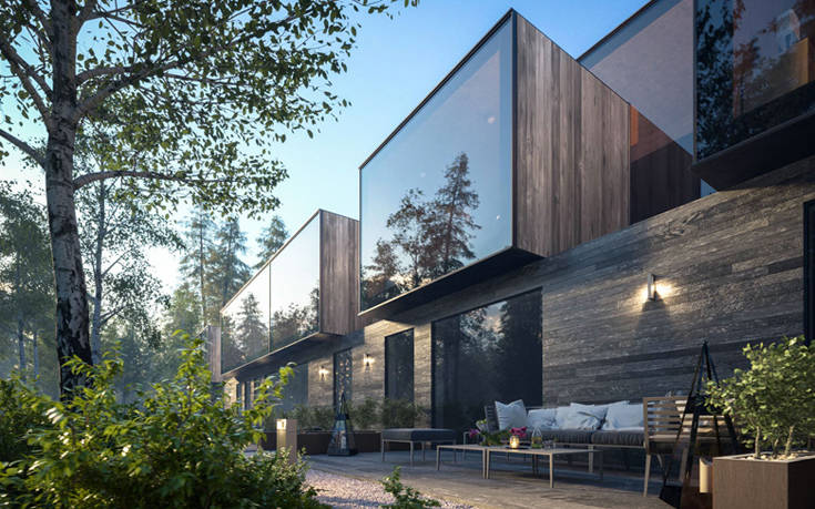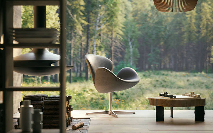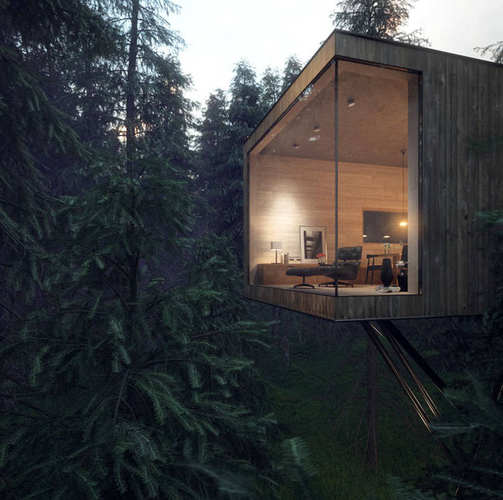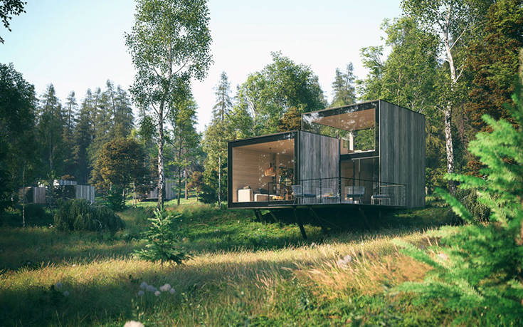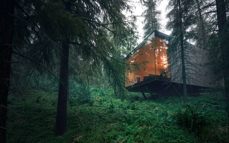 Δεν είναι παρά μια σειρά από ξύλινοι όγκοι διάσπαρτοι στο κατάφυτο δάσος, που έρχονται να λειτουργήσουν συμπληρωματικά στο φυσικό τοπίο με τα τραχιά υλικά τους, το ξύλο, την πέτρα και το γυαλί.