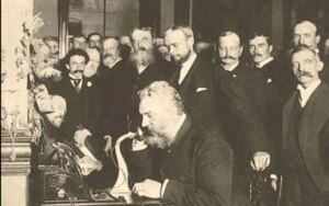 On March 10, 1876, Alexander Graham Bell makes the first telephone call in his Boston, Mass., laboratory. During the brief call, the Scottish-born inventor famously summoned his assistant, Thomas A. Watson, who was in another room, saying “Mr. Watson, come here; I want you.” Bell had received a patent on his telephone just three days before the call. He subsequently displayed his invention at exhibitions in Boston and Philadelphia, and in October, he made a two-mile call from Boston to Cambridgeport. (Photo: Bell at the opening of the long-distance line from New York to Chicago in 1892) |