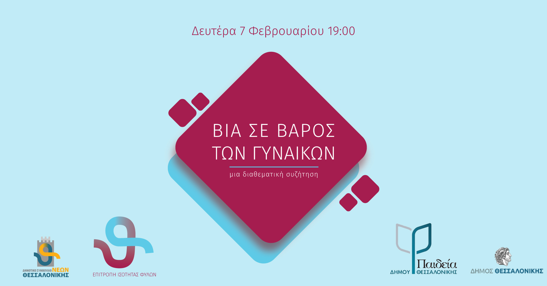 Με αφορμή τα ολοένα αυξανόμενα περιστατικά έμφυλης βίας, η Αντιδημαρχία Παιδείας του Δήμου Θεσσαλονίκης διοργανώνει σε συνεργασία με το Δημοτικό Συμβούλιο Νέων Θεσσαλονίκης τη διαδικτυακή εκδήλωση «Βία σε βάρος των γυναικών: μια διαθεματική συζήτηση», τη Δευτέρα 07 Φεβρουαρίου 2022, στις 19:00. “Συνεχείς καταγγελίες για περιστατικά έμφυλης βίας έκλεισαν με τον χειρότερο τρόπο μια χρονιά κατά την οποία το κίνημα #metoo ξέσπασε και στη χώρα μας, μια χρονιά που σφραγίστηκε από 19 γυναικοκτονίες. Η έμφυλη βία σε κάθε μορφή της παρατηρείται καθημερινά και στρέφεται ενάντια στα πιο αδύναμα και ευάλωτα άτομα. Κι επειδή ο μόνος τρόπος είναι η συνειδητοποίηση και η ευαισθητοποίηση, οφείλουμε να διαπαιδαγωγήσουμε σωστά τη νέα γενιά στην οποία εναποθέτουμε το μέλλον και τις ελπίδες μας”, ανέφερε σχετικά η Αντιδήμαρχος Παιδείας Ιωάννα Κοσμοπούλου, τονίζοντας: “Γονείς, σχολεία και πολιτεία πρέπει να δουλέψουμε από κοινού προς αυτήν την κατεύθυνση. Στην προσπάθεια να φέρουμε το μήνυμα στις νέες και νέους της πόλης μας αλλά και μέσα στα σχολεία, η Αντιδημαρχία Παιδείας σε συνεργασία με το Δημοτικό Συμβούλιο Νέων Θεσσαλονίκης διοργανώνει τη διαδικτυακή δράση ‘Βία σε βάρος των γυναικών: μια διαθεματική συζήτηση’. Ας κάνουμε ένα μικρό βήμα για την εξάλειψη της βίας σε κάθε μορφή της. Όλοι μαζί μπορούμε!”. Η εκδήλωση θα πραγματοποιηθεί μέσω Zoom (Join Zoom Meeting https://us02web.zoom.us/j/88209132143 Meeting ID: 882 0913 2143) και θα μεταδοθεί ζωντανά από το κανάλι του Δήμου Θεσσαλονίκης στο Youtube https://www.youtube.com/c/cityofthessaloniki. Περισσότερες πληροφορίες για την εκδήλωση: 2313 318.661 και 2313 318.663.