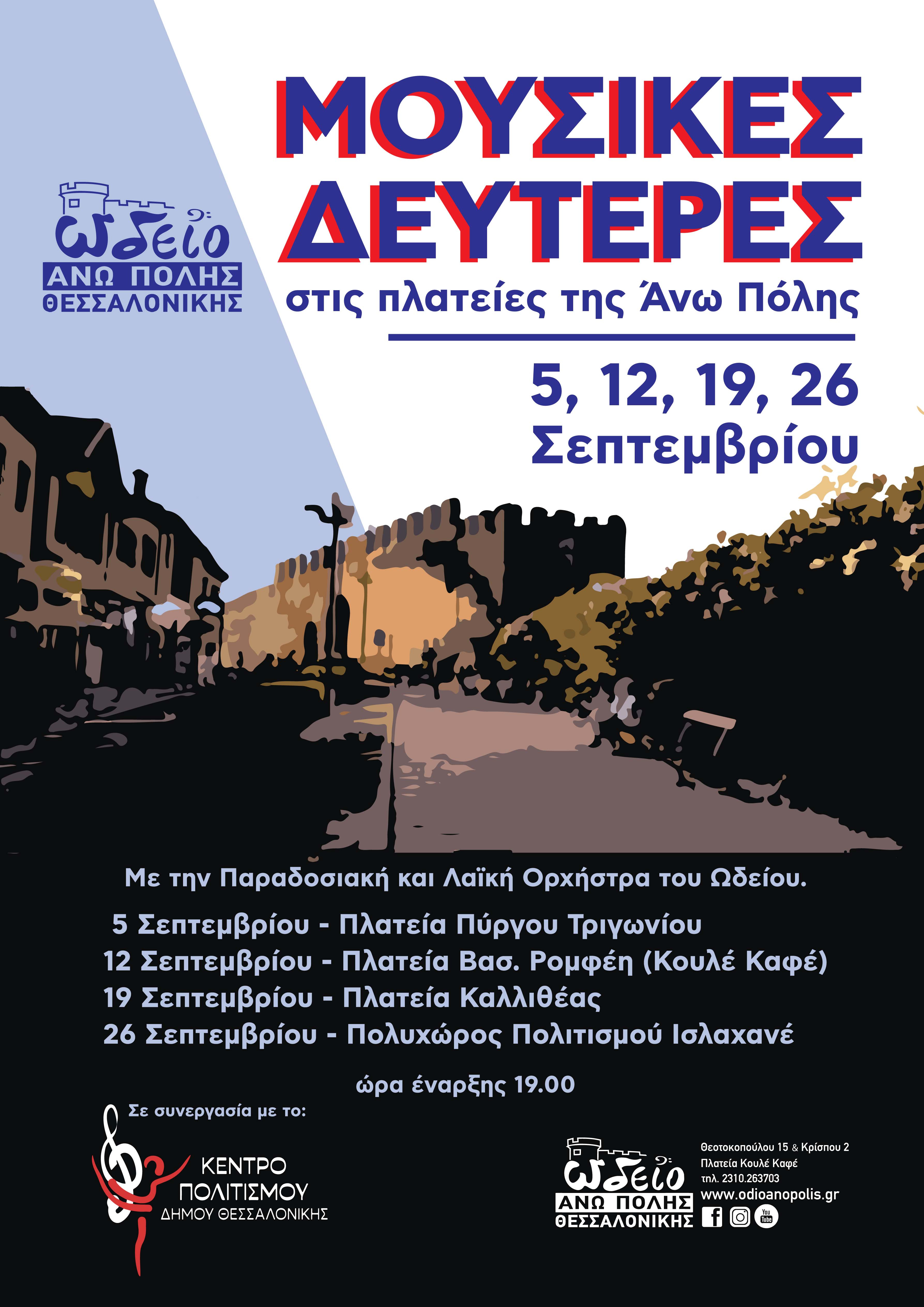 Την Δευτέρα 5 Σεπτεμβρίου 2022 στις 19.30 και κάθε Δευτέρα του Σεπτέμβρη, το Ωδείο Άνω Πόλης σε συνεργασία με το Κέντρο Πολιτισμού του Δήμου Θεσσαλονίκης, εγκαινιάζει μια νέα σειρά υπαίθριων συναυλιών στις γραφικές πλατείες της Άνω Πόλης με ελεύθερη είσοδο για το κοινό.