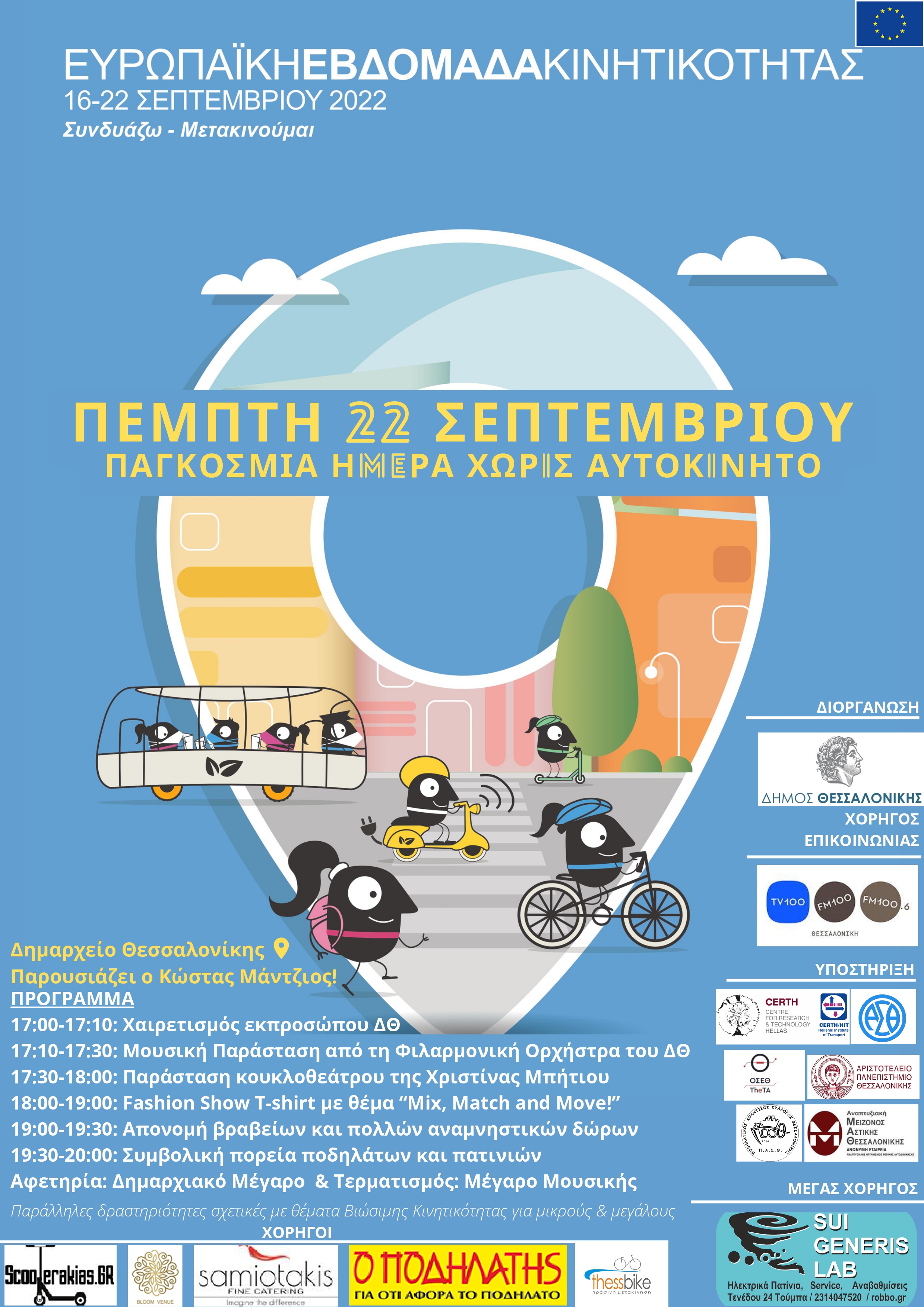 Ο Δήμος Θεσσαλονίκης συμμετέχει φέτος ενεργά και πρωτότυπα στην Ευρωπαϊκή Εβδομάδα Κινητικότητας. Η κεντρική εκδήλωση για την Ημέρα Χωρίς Αυτοκίνητο θα πραγματοποιηθεί την Πέμπτη 22 Σεπτεμβρίου, στις 5.00 το απόγευμα, στο εξωτερικό αμφιθέατρο του Δημαρχιακού Μεγάρου. Το πρόγραμμα της εκδήλωσης μεταξύ άλλων περιλαμβάνει:- Μουσική παράσταση από τη Φιλαρμονική Ορχήστρα του Δήμου Θεσσαλονίκης