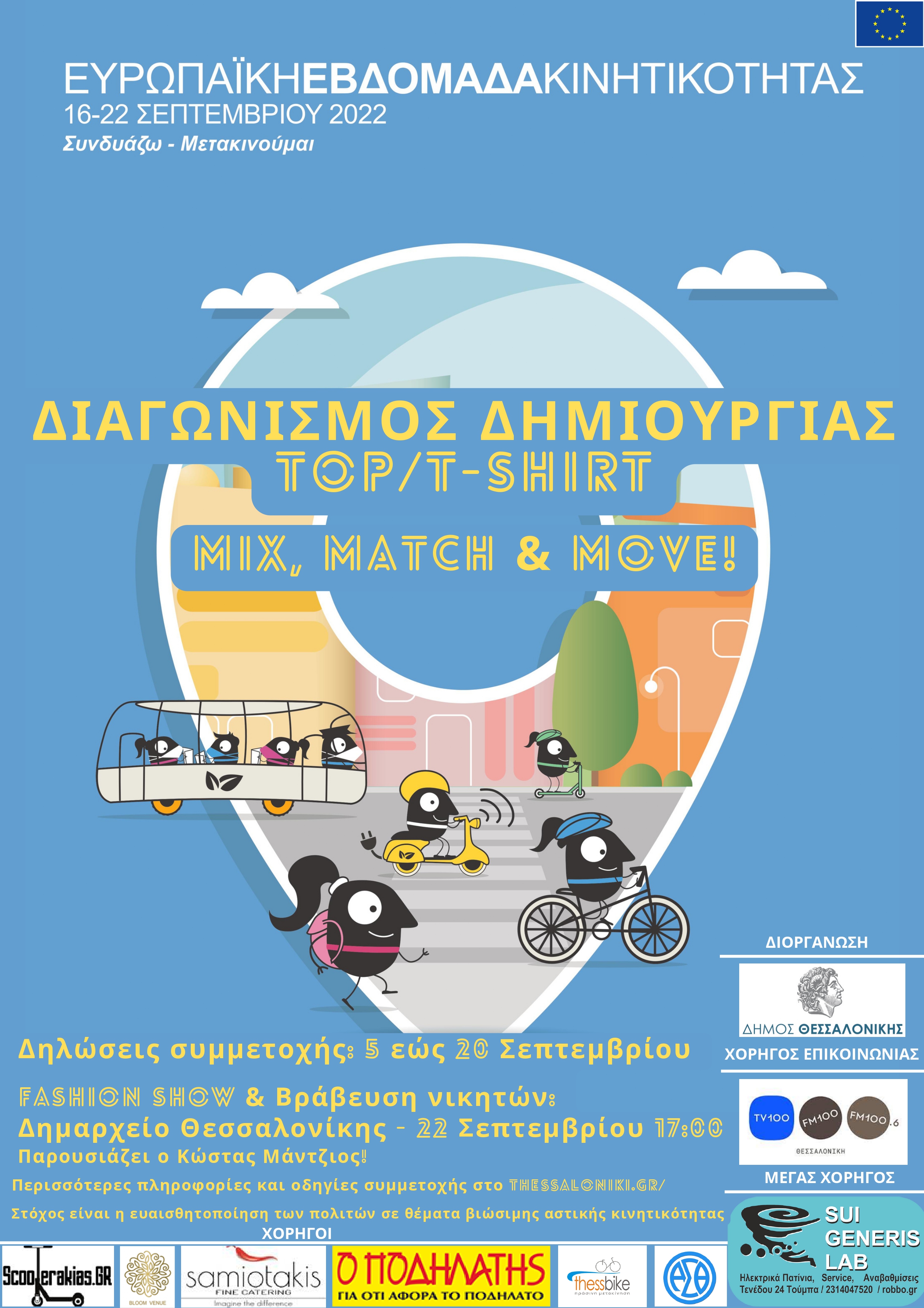 Ανοιχτή πρόσκληση συμμετοχής στον διαγωνισμό δημιουργίας Top/T-shirt Στο πλαίσιο του εορτασμού της Ευρωπαϊκής Εβδομάδας Κινητικότητας ο Δήμος Θεσσαλονίκης καλεί τους ενδιαφερόμενους όλων των ηλικιών να δηλώσουν συμμετοχή στον διαγωνισμό δημιουργίας Top/T-shirt με έμπνευση από το φετινό σύνθημα της ΕΕΚ «Mix & Move: Συνδυάζω- Μετακινούμαι». Οι δηλώσεις συμμετοχής θα γίνονται δεκτές μέχρι τις 20 Σεπτεμβρίου εδώ. Οι συμμετέχοντες καλούνται να οπτικοποιήσουν τις σκέψεις, τις ιδέες και τον προβληματισμό τους αναφορικά με το θέμα του διαγωνισμού με πρωτότυπο τρόπο. Οι δημιουργίες θα παρουσιαστούν σε επίδειξη μόδας με τίτλο «Mix, Match and Move!», που θα πραγματοποιηθεί την Πέμπτη 22 Σεπτεμβρίου και ώρα 17:00 στον αύλειο χώρο του Δημαρχιακού Μεγάρου. Μπορείτε να αναζητήσετε αναλυτικές πληροφορίες για τον διαγωνισμό εδώ. |