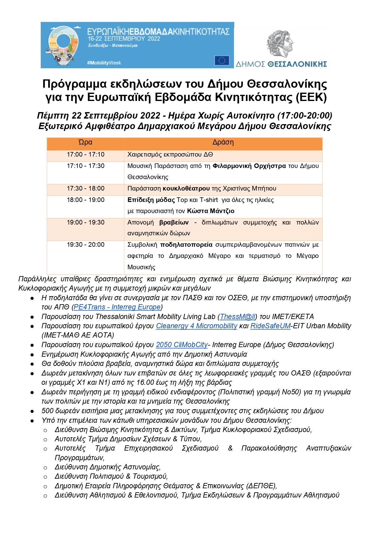 - Παράλληλες υπαίθριες δραστηριότητες και ενημέρωση σχετικά με θέματα βιώσιμης κινητικότητας και κυκλοφοριακής αγωγής