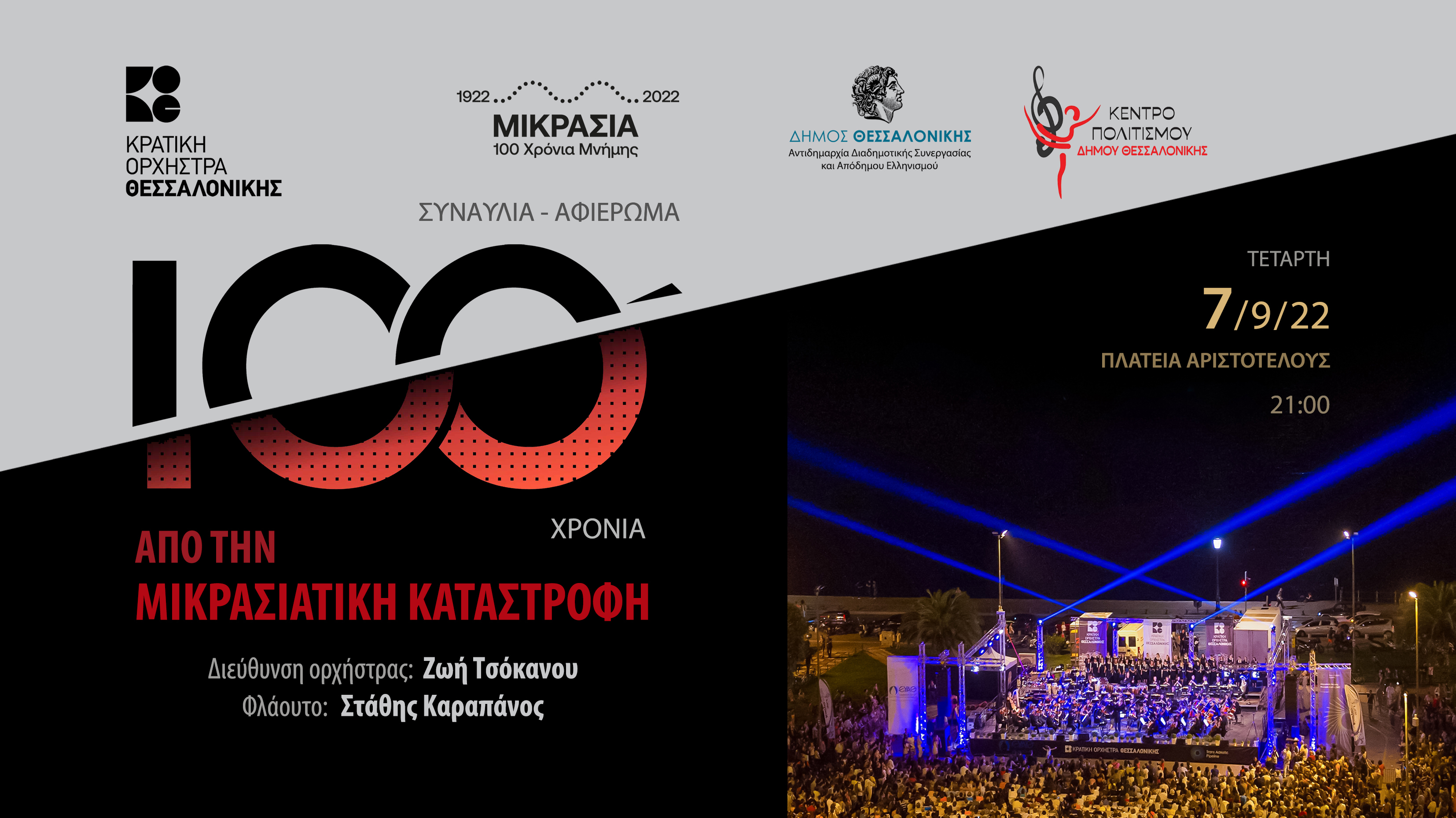 O Δήμος Θεσσαλονίκης και η Κρατική Ορχήστρα Θεσσαλονίκης τιμούν την επέτειο μνήμης των 100 χρόνων από τη Μικρασιατική Καταστροφή με έργα έντονων συμβολισμών -Ελλήνων και ξένων συνθετών- σε μια ανοιχτή συναυλία της Κ.Ο.Θ. στην καρδιά της πόλης, την πλατεία Αριστοτέλους, την Τετάρτη 7 Σεπτεμβρίου, στις 21.00. Την Κ.Ο.Θ. διευθύνει η Καλλιτεχνική της Διευθύντρια Ζωή Τσόκανου. Σολίστ στο φλάουτο ο ιδιαιτέρως ταλαντούχος Στάθης Καραπάνος, που διαπρέπει στο εξωτερικό και πρόσφατα (2020) του απονεμήθηκε το περιώνυμο «Βραβείο Μπερνστάιν», ενώ τον περασμένο Μάιο έλαβε το Βραβείο «Νέου Καλλιτέχνη της Μουσικής 2020/21», από την Ένωση Ελλήνων Θεατρικών και Μουσικών Κριτικών (ΕΕΘΜΚ). Το πρόγραμμα ξεκινά με τη «Δωδεκανησιακή Σουίτα αρ.1» του Γιάννη Κωνσταντινίδη, μία σύνθεση που έδωσε νέα πνοή σε παραδοσιακά τραγούδια των Δωδεκανήσων, από έναν δημιουργό με καταγωγή από τη Σμύρνη. Ακολουθούν η μελαγχολική «Παβάνα» του Φωρέ και η δραματική εισαγωγή από την όπερα «Η Δύναμη του Πεπρωμένου» του Βέρντι με το χαρακτηριστικό μοτίβο της Μοίρας. Η Κ.Ο.Θ. θα παρουσιάσει σε πρώτη παγκόσμια εκτέλεση το έργο του Έλληνα συνθέτη και πιανίστα Αχιλλέα Γουάστωρ «Time Lapse» και στη συνέχεια θα ακουστεί η «Εισαγωγή αρ.1 πάνω σε Τρία Ελληνικά Θέματα» του Γκλαζουνώφ. Το πρόγραμμα ολοκληρώνεται με τον εμβληματικό «Ζορμπά» του Μίκη Θεοδωράκη, σε μια μεταγραφή της σουίτας του μπαλέτου για φλάουτο και ορχήστρα, σε πρώτη πανελλήνια εκτέλεση.