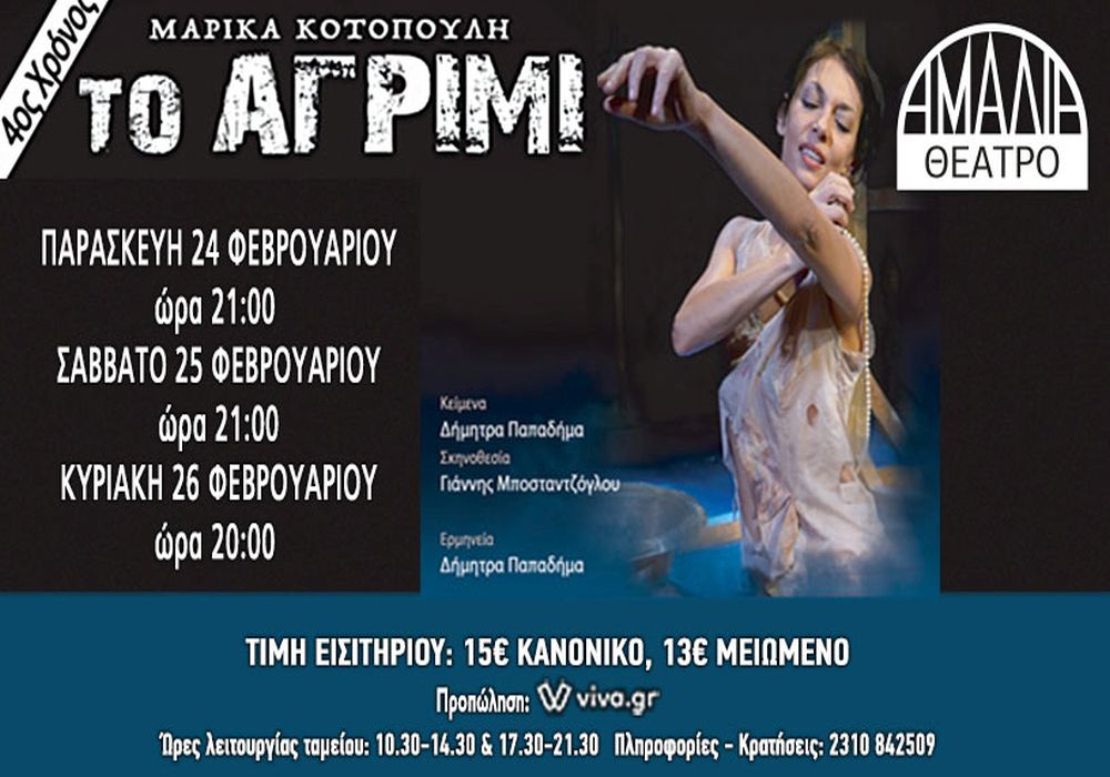 Η θεατρική παράσταση «Το Αγρίμι» με την Δήμητρα Παπαδήμα, ανεβαίνει στη Θεσσαλονίκη, στο Θέατρο Αμαλία, την Παρασκευή 24 και Σάββατο 25 Φεβρουαρίου στις 21.00.