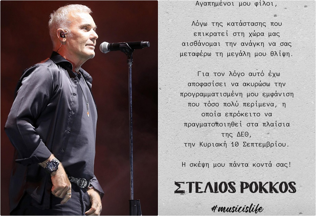 Ο αγαπημένος καλλιτέχνης Στέλιος Ρόκκος με ανακοίωσή του κάνει γνωστό οτι ακυρώνει την εμφάνισή του στην ΔΕΘ την προσεχή Κυριακή 10 Σεπτεμβρίου λόγω της κατάστασης που βιώνει η Χώρα μετα το πέρασμα της κακοκαιρίας Daniel.