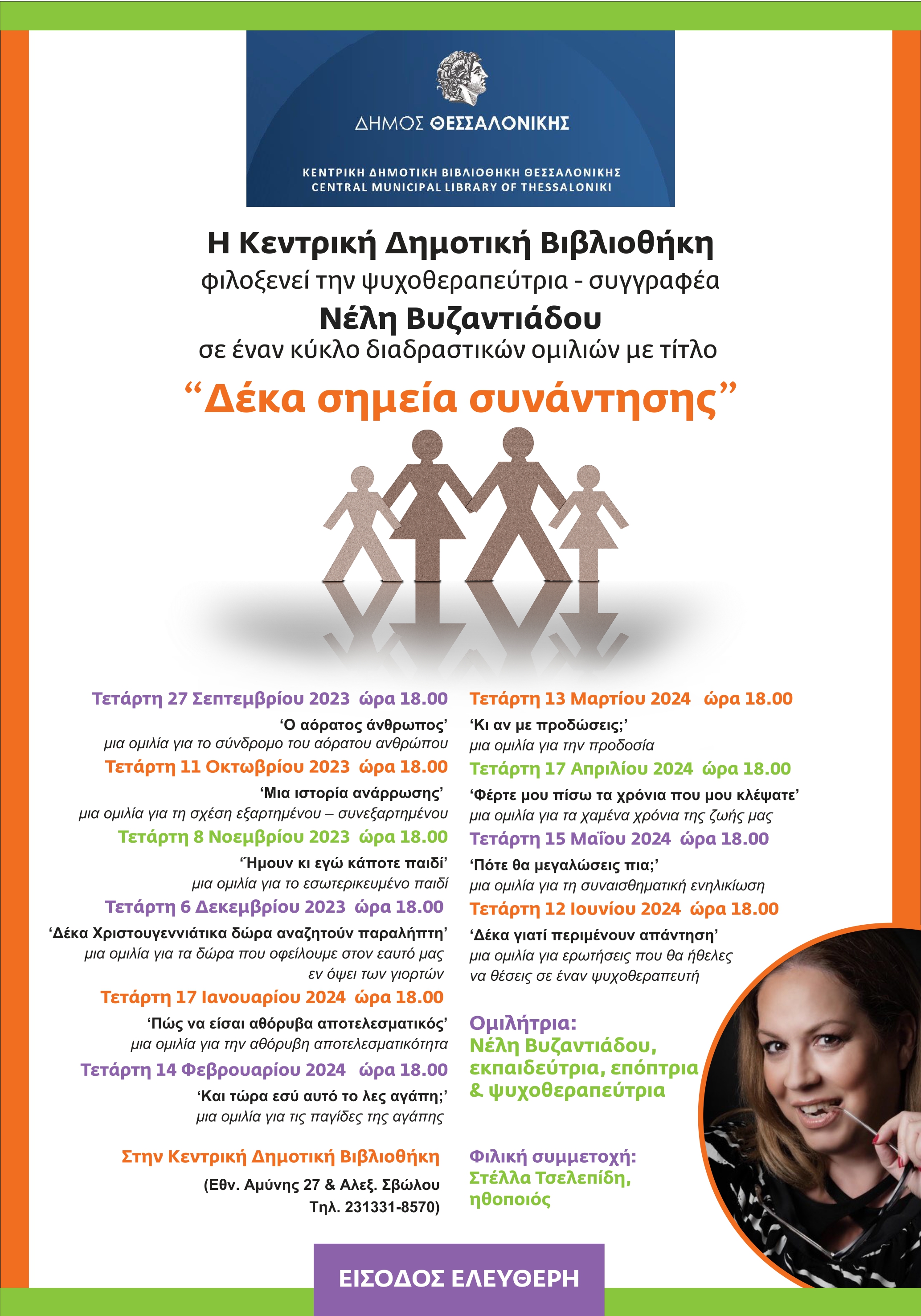 Η Κεντρική Δημοτική Βιβλιοθήκη Θεσσαλονίκης διοργανώνει έναν κύκλο διαδραστικών ομιλιών με τίτλο «Δέκα σημεία συνάντησης» και ομιλήτρια την ψυχοθεραπεύτρια – συγγραφέα Νέλη Βυζαντιάδου. Η έναρξη του κύκλου θα γίνει την Τετάρτη 27 Σεπτεμβρίου και ώρα 18.00 στην Κεντρική Δημοτική Βιβλιοθήκη.