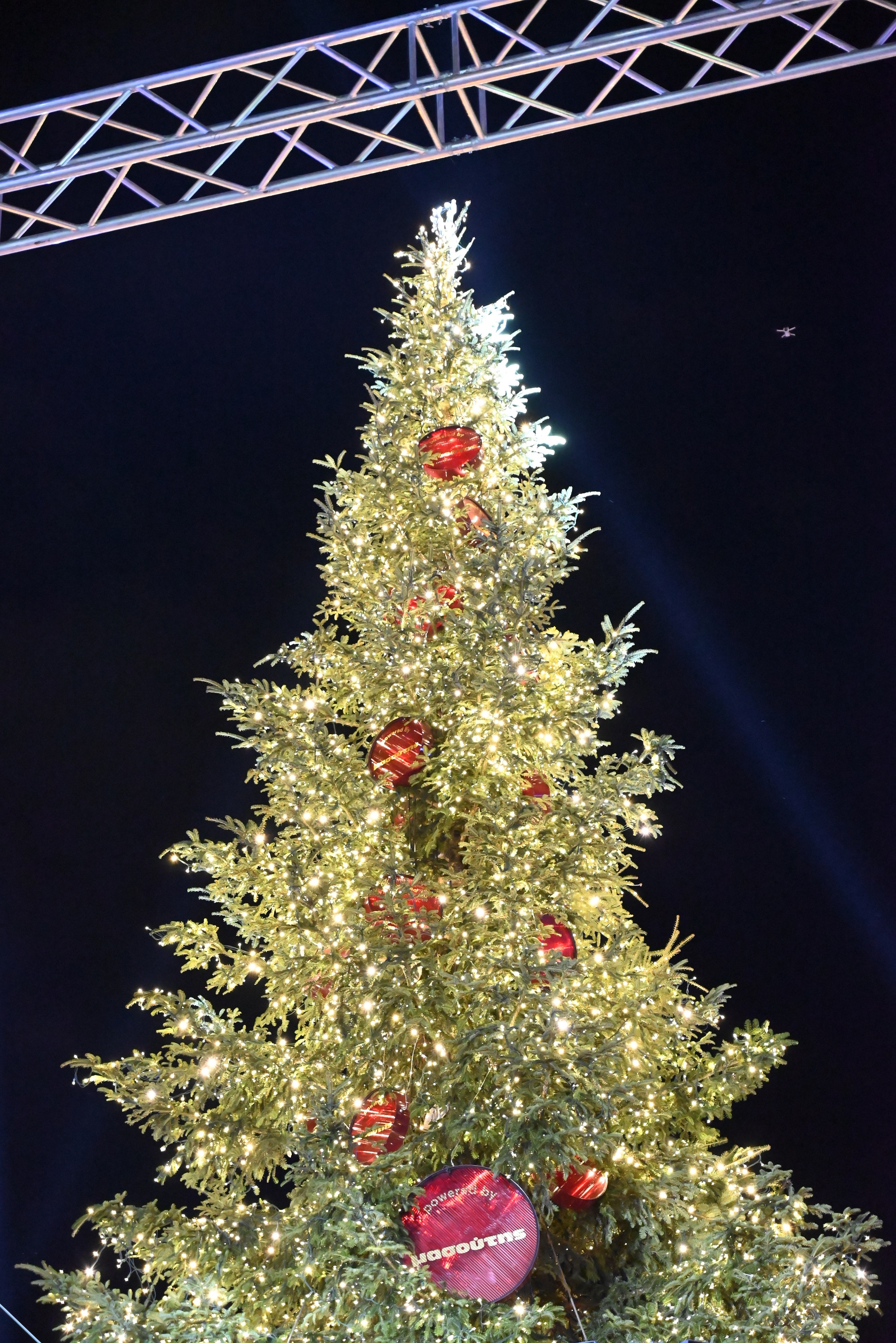 Το χριστουγεννιάτικο δέντρο που στήθηκε στην πλατεία Αριστοτέλους είναι ύψους 17 μέτρων, μεταφέρθηκε από το Παλαιοχώρι Χαλκιδικής και στολίστηκε με 100.000 γιορτινά λαμπιόνια χαμηλής ενεργειακής κατανάλωσης.