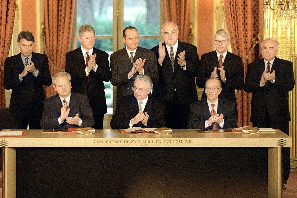 1995 The Dayton Agreement is signed in Paris by leaders of various governments ending the conflict in the former Yugoslavia including Slobodan Milošević, Alija Izetbegović, Franjo Tuđman and Bill Clinton. |