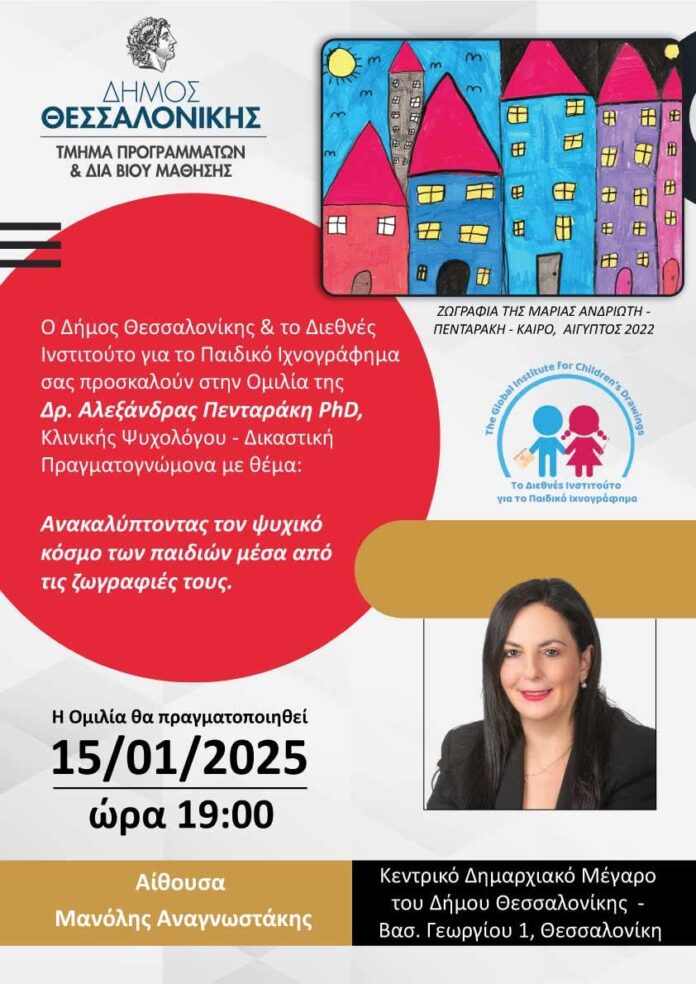 Ο Δήμος Θεσσαλονίκης και η Αντιδημαρχία Παιδείας & Δια Βίου Μάθησης σε συνεργασία με το Διεθνές Ινστιτούτο για το Παιδικό Ιχνογράφημα και την Δρ Αλεξάνδρα Πενταράκη, Διδάκτορα Ψυχολογικής Ιατρικής του Πανεπιστημίου του Λονδίνου, οργανώνει διάλεξη με τίτλο «Ανακαλύπτοντας τον ψυχικό κόσμο των παιδιών μέσα από τις ζωγραφιές τους», την Τετάρτη 15 Ιανουαρίου, στις 19:00, στην αίθουσα Μανόλης Αναγνωστάκης του Δημαρχείου Θεσσαλονίκης.