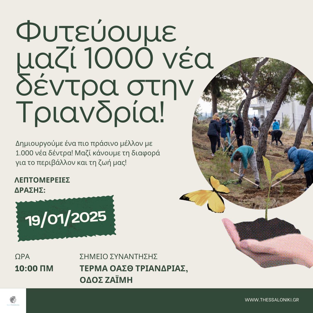 Ο Δήμος Θεσσαλονίκης και η Αντιδημαρχία Αστικού Πρασίνου και Περιβάλλοντος με τη συνεργασία της Διεύθυνσης Αναδασώσεων Κεντρικής Μακεδονίας, του Συλλόγου Μελισσοκόμων Θεσσαλονίκης και με τη χορηγία της ΑΜΚΕ ΠΗΓΗ προχωρούν την Κυριακή 19 Ιανουαρίου στη φύτευση 1000 ακόμη δένδρων στο, υπό διαμόρφωση, περιαστικό Δάσος Τριανδρίας (έκτασης 20 στρεμμάτων).