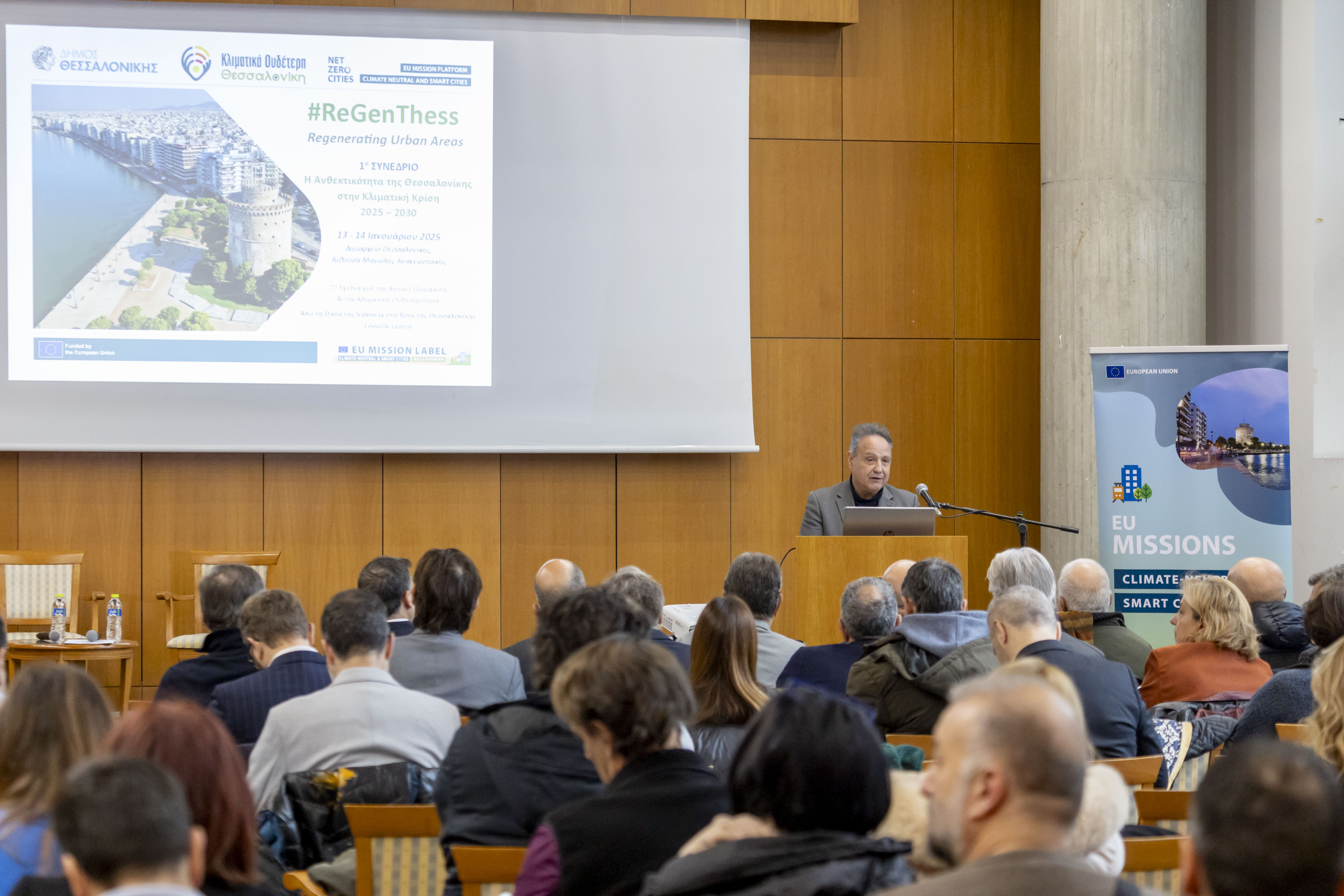 Ο κ. Αγγελούδης σημείωσε πως ο Δήμος Θεσσαλονίκης πρωτοστατεί στην προσπάθεια κλιματικής ουδετερότητας συμμετέχοντας ενεργά ως μέλος του Ευρωπαϊκού Δικτύου των Κλιματικά Ουδέτερων Πόλεων (NET ZERO CITIES) στη βάση του εγκεκριμένου από την Ευρωπαϊκή Επιτροπή Κλιματικού Συμφώνου Θεσσαλονίκης αλλά και ως μέλος του Παγκόσμιου Δικτύου των Ανθεκτικών πόλεων (RESILIENT CITIES NETWORK), το οποίο ήδη από το 2015 αναλαμβάνει δράση για τον σχεδιασμό βιώσιμων αλλαγών Αστικής Ανθεκτικότητας. Τόνισε, όμως, ότι για την αντιμετώπιση της κλιματικής κρίσης απαιτούνται ευρείες συνεργασίες κι ένα νέο θεσμικό πλαίσιο που θα επιτρέπει στην πρωτοβάθμια αυτοδιοίκηση να καταρτίζει και να υλοποιεί επιχειρησιακά σχέδια δράσης.