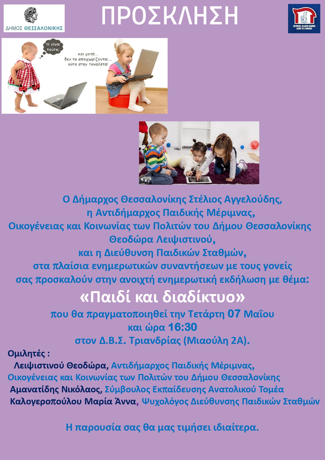 Ο Δήμος Θεσσαλονίκης, η Αντιδημαρχία Παιδικής Μέριμνας, Οικογένειας και Κοινωνίας των Πολιτών και η Διεύθυνση Παιδικών Σταθμών σας προσκαλούν την Τετάρτη 7 Μαΐου στις 16.30 στην ανοιχτή ενημερωτική εκδήλωση με θέμα «Παιδί και Διαδίκτυο» στον Δημοτικό Βρεφονηπιακό Σταθμό Τριανδρίας (Μιαούλη 2 Α).